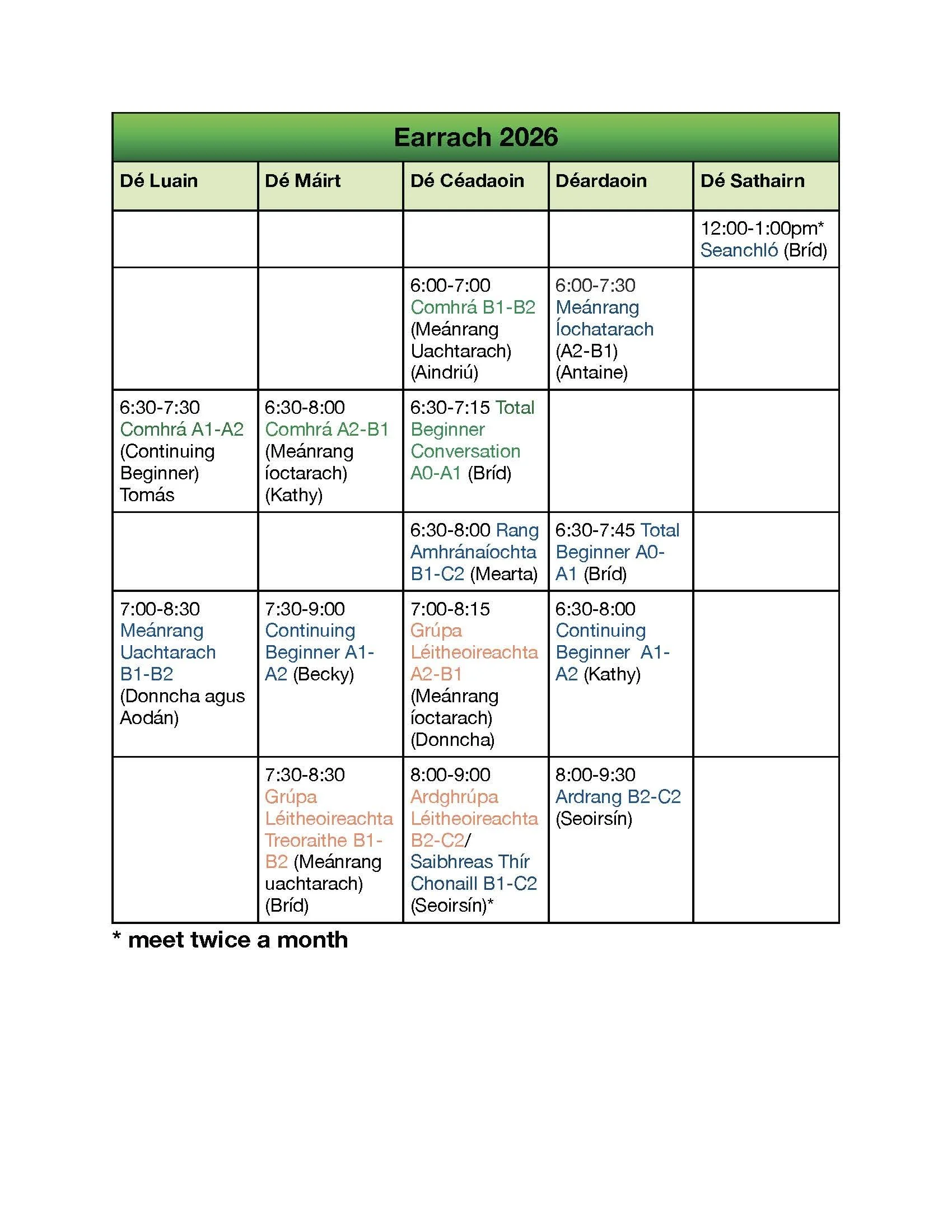April 6-June 12. Registration will CLOSE April 2, 2026. Note that schedule for comhrá and reading groups are subject to change, depending on teacher schedule.